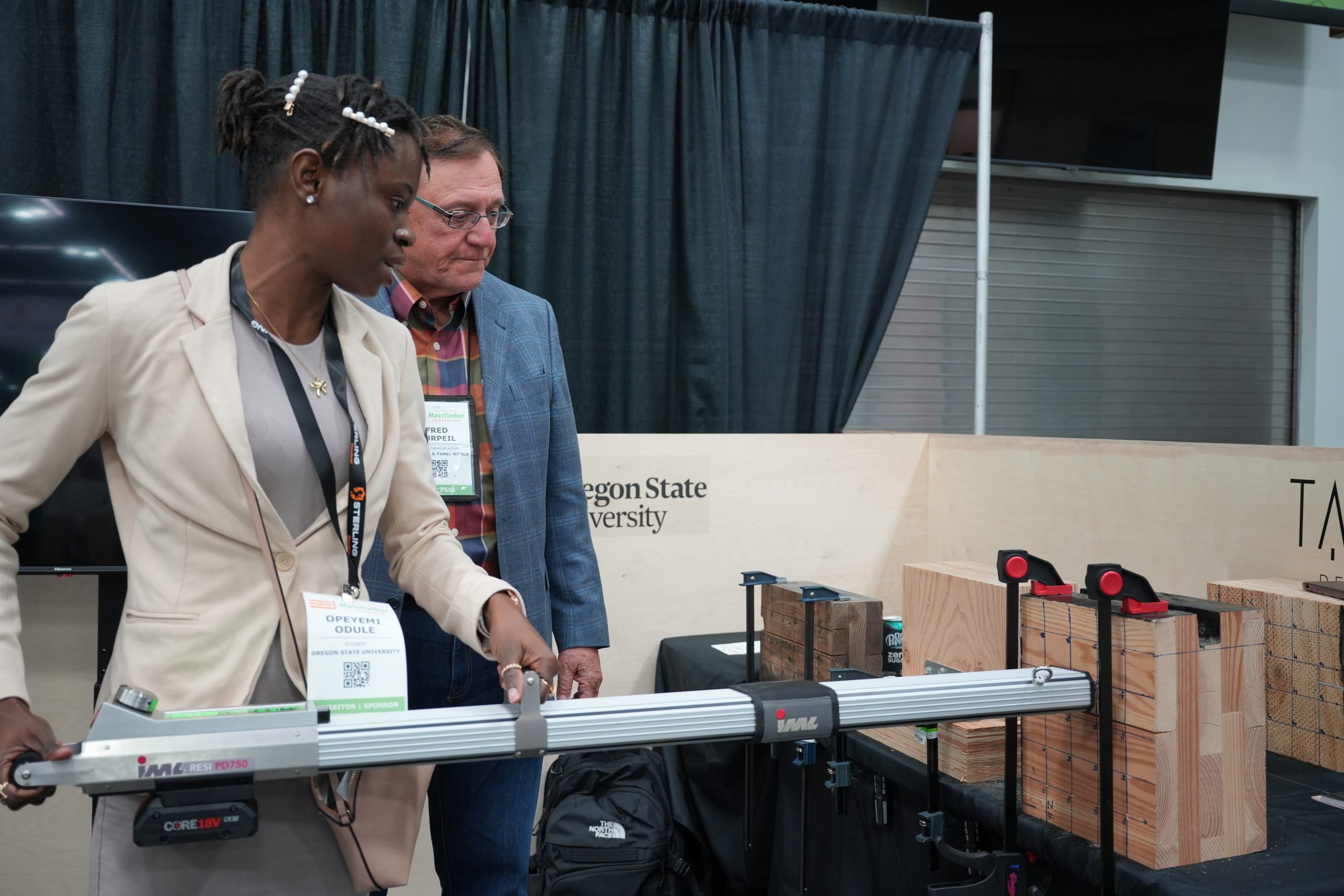 In the Biodeterioration Lab, Dr. Gerald Presley, Dr. Mariapaola Riggio, and Opeyemi Odule are taking a different approach by using resistance drills to develop methods to detect both delamination and decay in-situ in mass timber elements made of CLT and MPP. These drills are minimally invasive and are currently in use for monitoring decay in standing trees and utility poles. They also can enable the detection of problems within mass timber composites not visible to inspectors on surfaces.
