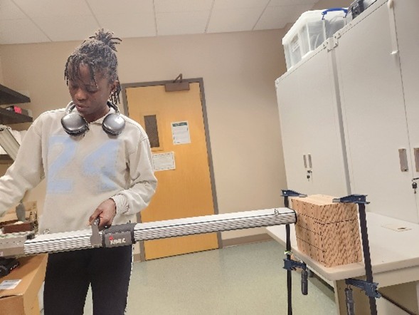 In the Advanced Manufacturing Lab, Dr. Vahid Nasir, Ashley McCann, and Autumn Battisti are investigating the use of ultrasound to identify glue-line issues in CLT. They are working alongside Dr. Lech Muszynski and Samson Idoghor, who are creating CLT samples with known thickness variations for a related project on delamination effects, to test ultrasound sensors’ ability to identify areas of potential delamination inside the material.