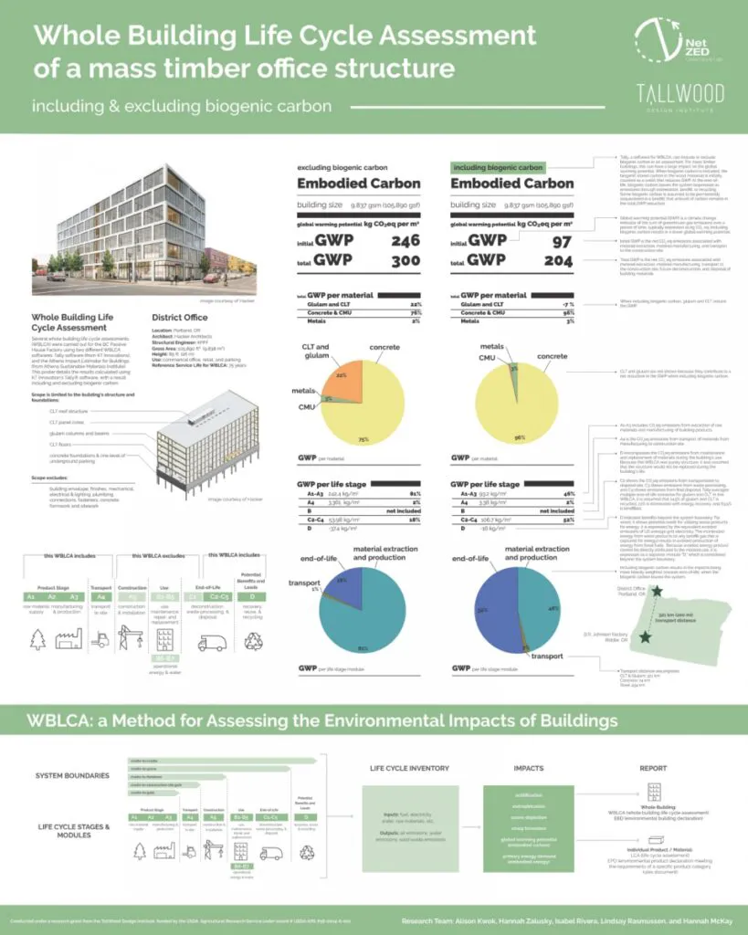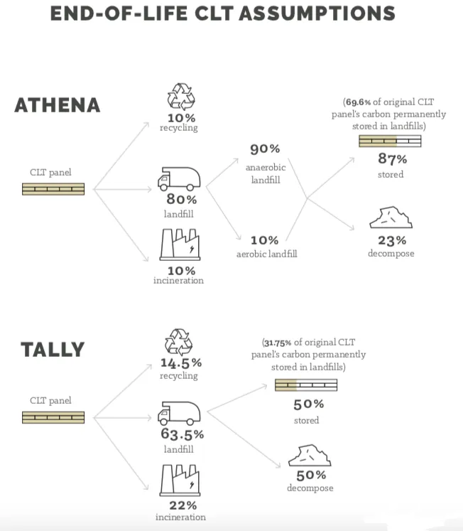 The embodied carbon of buildings is typically measured by global warming potential and some biogenic carbon methodologies result in significantly lower estimations of global warming potential. Although LCA standards offer some guidance about biogenic carbon methodologies, there is still work needed to standardize end-of-life scenarios and assumptions about sustainable forestry. For CLT and other mass timber buildings, a consistent environmental assessment will help validate their potential environmental benefits.